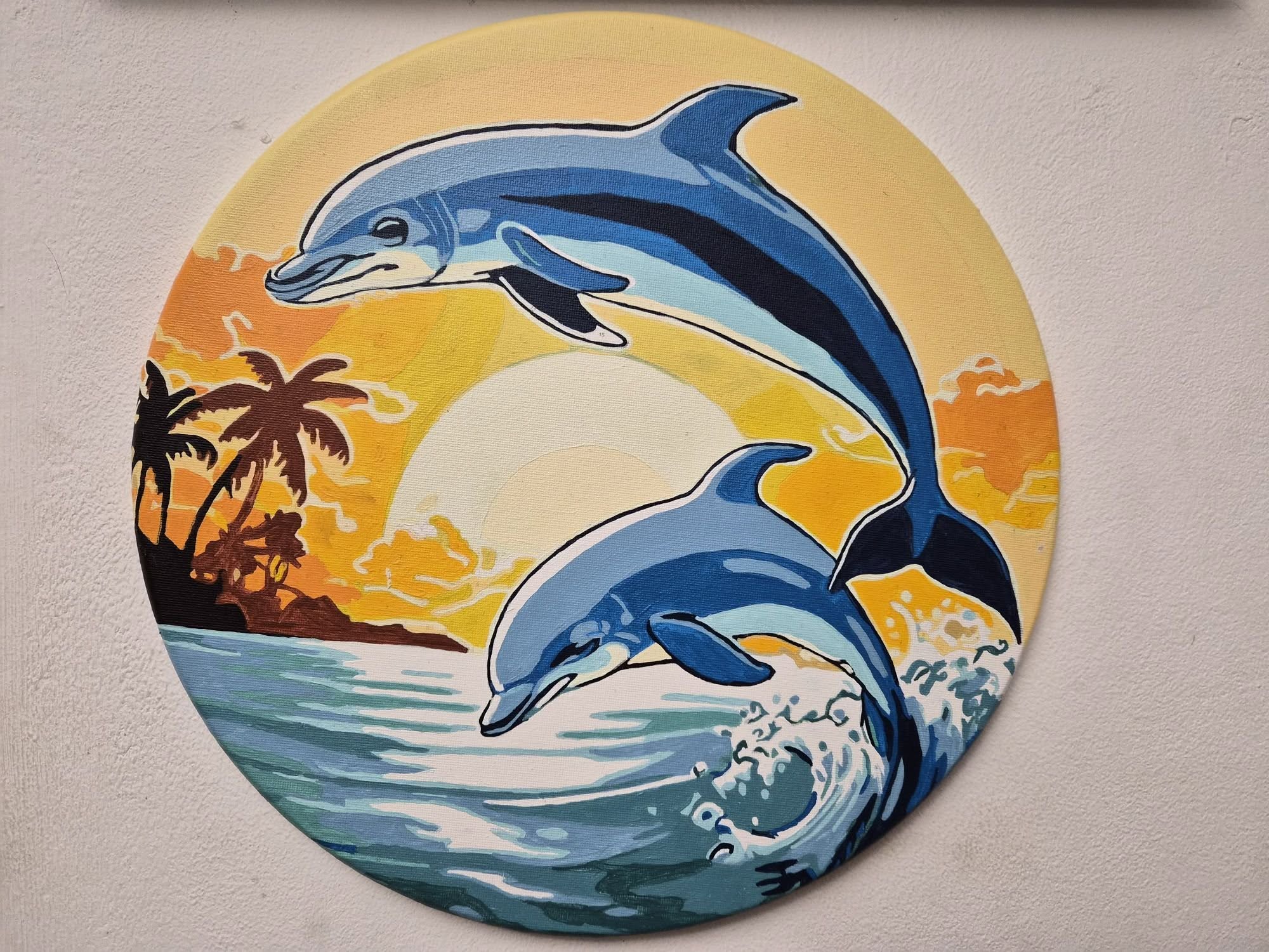 „Delfini jucăuși” este o pictură pe numere rotundă, diametru 33 cm, care surprinde energia și bucuria delfinilor într-un cadru tropical plin de viață. Culorile vii și detaliile amuzante fac pictura captivantă și relaxantă, perfectă pentru copii și pentru iubitorii de animale marine. Setul include pânză numerotată, pensule și culori acrilice sigure și de calitate.