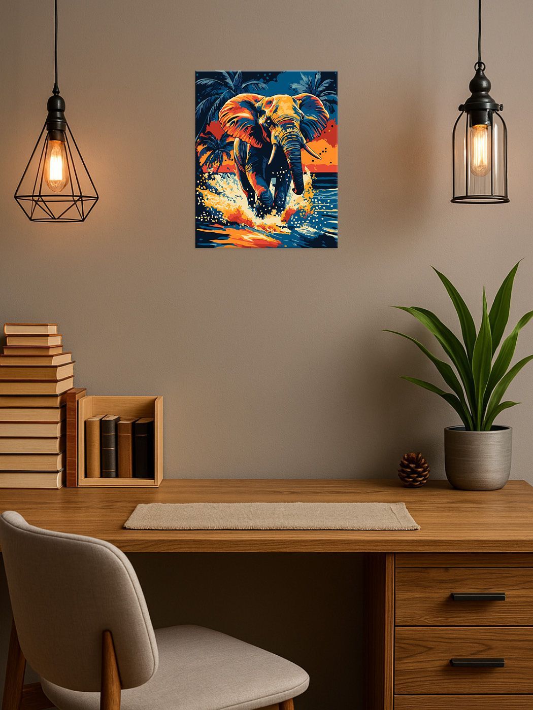 Această pictură pe numere surprinde un elefant impunător și plin de farmec, înconjurat de culori vibrante și accente fantastice, care îi conferă un aer magic și misterios. Detaliile atent lucrate evidențiază eleganța și grația acestui elefant, iar combinația de nuanțe vii creează o scenă plină de imaginație și inspirație. Această pictură oferă o experiență artistică captivantă, care combină frumusețea naturii cu un strop de fantezie.