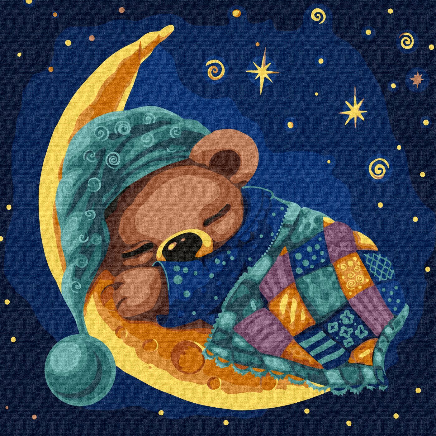 Somn confortabil este o pictură pe numere adorabilă, 30×30 cm, care prezintă un ursuleț care doarme liniștit pe o semilună, sub un cer înstelat, purtând căciulă și acoperit cu păturică. Culorile blânde și detaliile delicate creează o atmosferă de liniște și confort, perfectă pentru copii. Setul include pânză numerotată, pensule și culori acrilice sigure pentru cei mici.